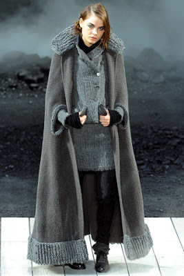 grunge-y boots, distressed chiffon & suede, masculine pleated trousers double cuffed for a louche feel, signature cardis shrunken down to layer, military stretched pockets, structure with rounded shoulders, quilted coats and belts combined with intense textural tops, warrior-like caplets, floor length capes lined with fur, full-on body suits paired with eternity scarves, hair is simple-- messy low done bun with side part flowing outward. Basically any look that could possibly prepare you for 2012. right here. right now.